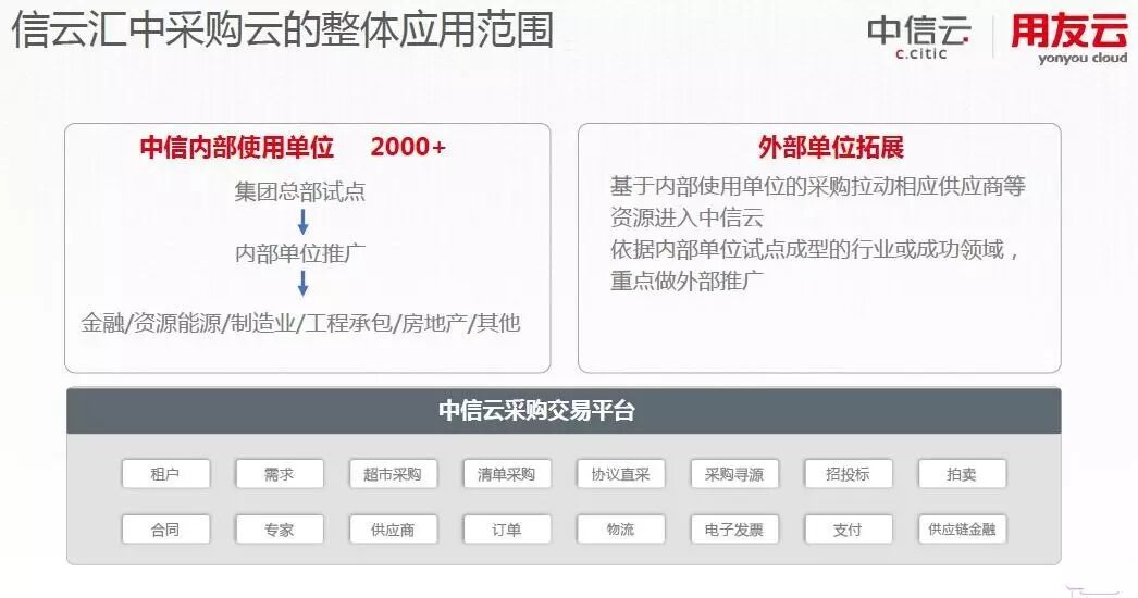 比如,目前中信云正基于与用友采购云核心产品友云采的整合,构建面向全集团的共享采购平台。