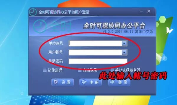 1:双击进入全时可视协同办公平台,输入账号和密码请输入图片说明