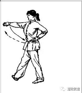 左腿屈膝前弓,右脚前上成右虚步。同时左手向后划弧成勾手,右手顺右腿外侧向上挑掌。目视前方