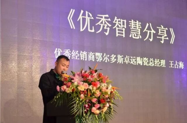鄂尔多斯王总作为卓远陶瓷的经销商代表也上台分享了自己与卓远陶瓷结缘以来的心得,并分享了自己的成功经验!王总说: “屈指算来,我加入卓远陶瓷已经有9年了,在这9年时间里我的团队与卓远一起经历风雨,一起成长,一起蜕变。我们对品牌长期以来地相互信任,相互支持,同舟共济,相濡以沫,让我感触很深,才有了鄂尔多斯卓远现在的成绩。我一直认为走品牌路线才是做陶瓷最大的出路,品牌也是终端竞争最有力的武器。一心一意地做好卓远品牌,依靠好产品和好服务形成强大的市场口碑,以真实力、真功夫打动每一位消费者,这就是我经营的致胜法宝”。王总的成功经验感动了在场的无数嘉宾!纷纷为其鼓掌!