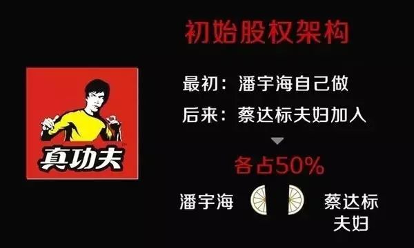 真功夫创始人叫潘宇海,是厨子出身,最早投资4万块开了家甜品店,后来引进两个股东,一个是他姐姐,一个是他姐夫蔡达标。夫妻俩也凑了4万块进来,这样就是两家各一半的股份。这种平分股权也为后期纠纷埋下了隐患。