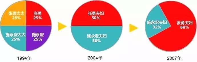 2004年,张勇劝说自己的太太最先企业,同时收回她手中的股权,同时,张勇也让施永宏的太太也离开企业,此后,张勇和施永宏各占股50%。