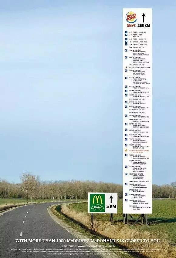 而在这个广告牌的旁边,麦当劳还特地为汉堡王立起了一块要高出好几倍的广告牌,上面密密麻麻地写着如何到达258公里之外的汉堡王门店。言下之意是说汉堡王的门店太少了,在高速公路上开车如果想找一家汉堡王填肚子的话,估计要饿死。
