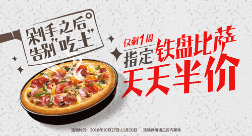 2016年10月27日开始至11月20日期间,购买以下指定5款铁盘比萨:新奥尔良风情烤肉比萨、超级至尊比萨、加州风情香烤牛肉比萨、海鲜至尊比萨、海鲜大狂欢比萨,即可享受如下半价优惠:周一至周五指定5款铁盘比萨普通装半价;周六至周日指定5款铁盘比萨小装半价,每单限点半价小装比萨一份。