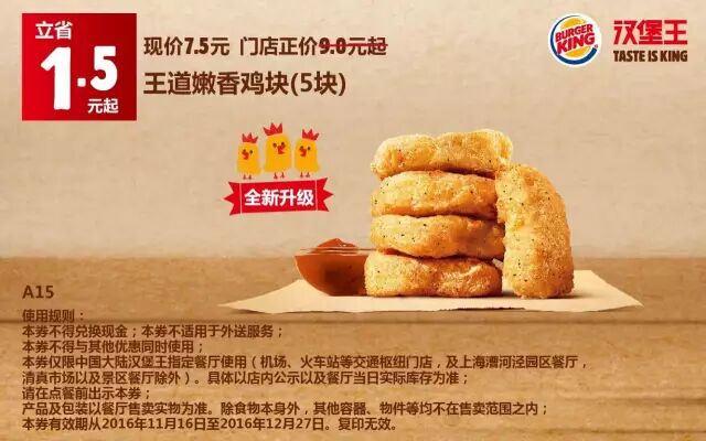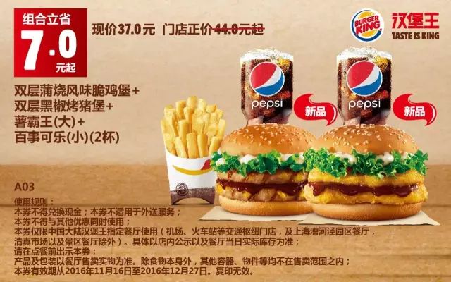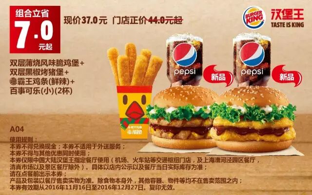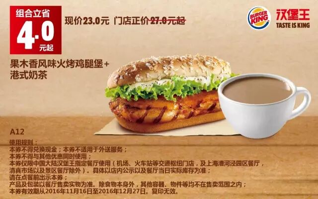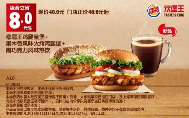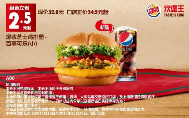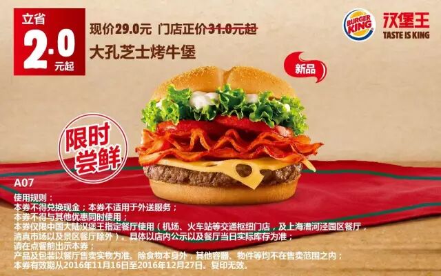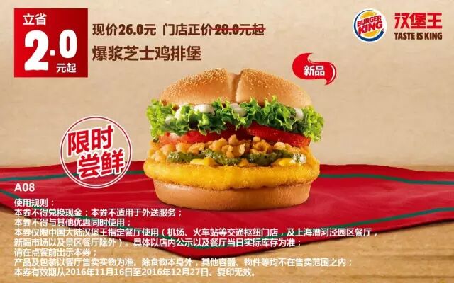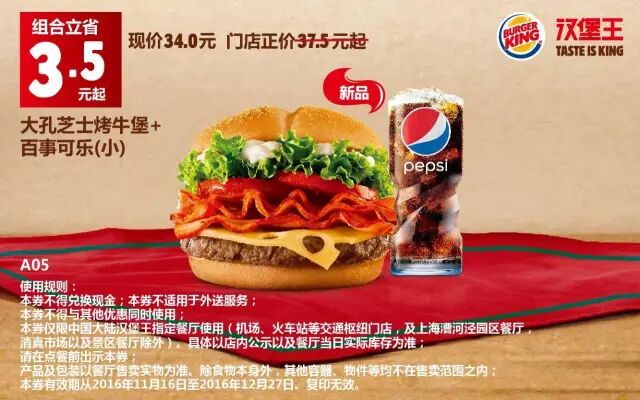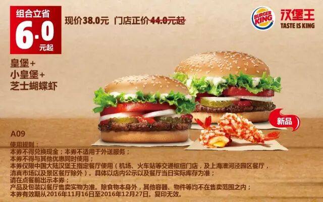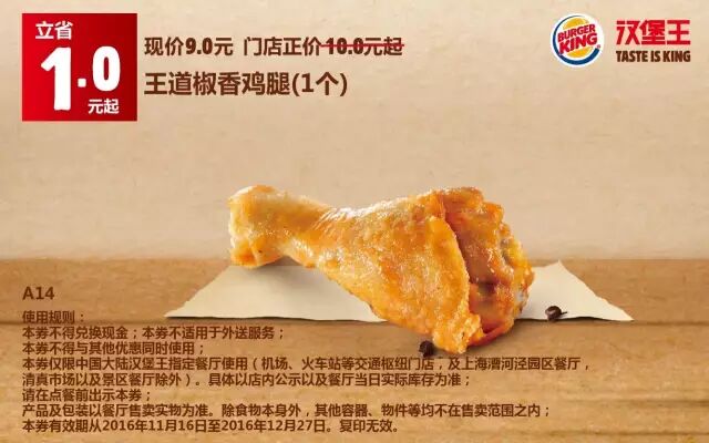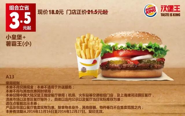 本券仅限全国汉堡王餐厅使用(机场,火车站等交通枢纽门店,及上海漕河泾园区餐厅,新疆市场以及景区餐厅除外)。具体以店内公示以及餐厅当日实际库存为准: