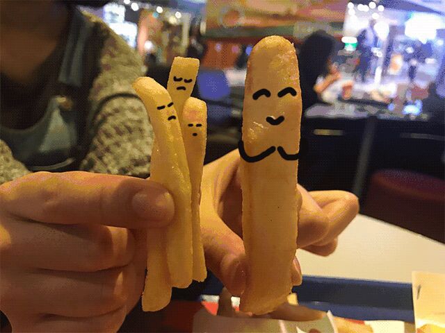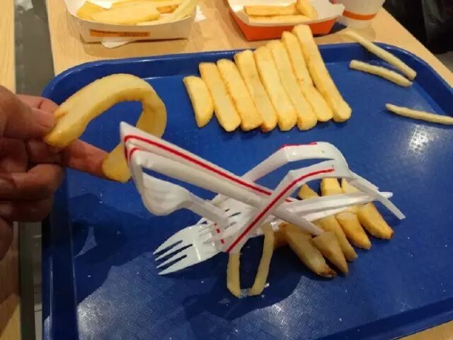以前看见男生吃细薯条,总有种“娘”的感觉。吃一根兰花指总是不自觉翘起来,一盒倒进嘴里又着实不雅。