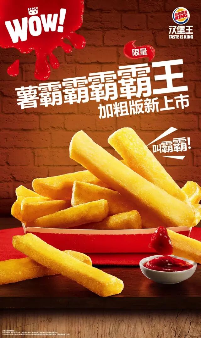 以前吃薯条我就只吃汉堡王,薯霸王又粗又香,现在升级成薯霸霸霸霸王,挑战极限的3/4英寸乘以3/8英寸黄金切割法,超大块头!口感更丰富!