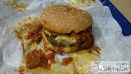 @玛奇朵--子轩:我勒个去……朋友今天发的汉堡王说不怎么样,我自己来试一下,一打开是这样的。完全没食欲,虽然经理过来说肉酱加多了,新员工不怎么会弄,要给我换。但这样不是砸自己牌子吗。汗