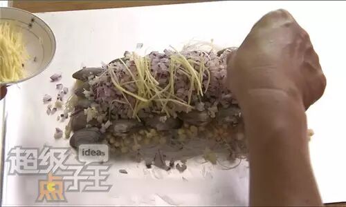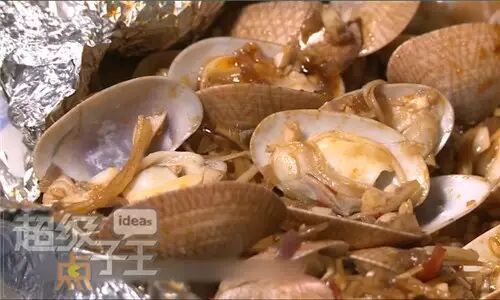 第四层撒上蒜末、姜丝和洋葱粒,最后把调好的酱汁淋在花甲螺上。↓