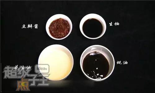 接下来调制酱汁,在碗里加入1勺花生油、1勺蚝油、1勺豆瓣酱、1勺生抽,花生油、蚝油、豆瓣酱和生抽的比例是1:1:1:1。↓