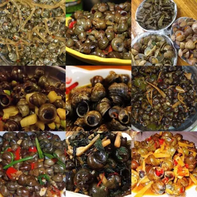 田螺鸭脚煲、砂煲螺、锡纸花甲螺、车螺芥菜汤、香辣脆螺、咖喱青口螺、爆炒指甲螺、丁螺、竹螺、红螺、石螺、响螺、海狮螺、粉丝蒸带子螺、风味海螺……