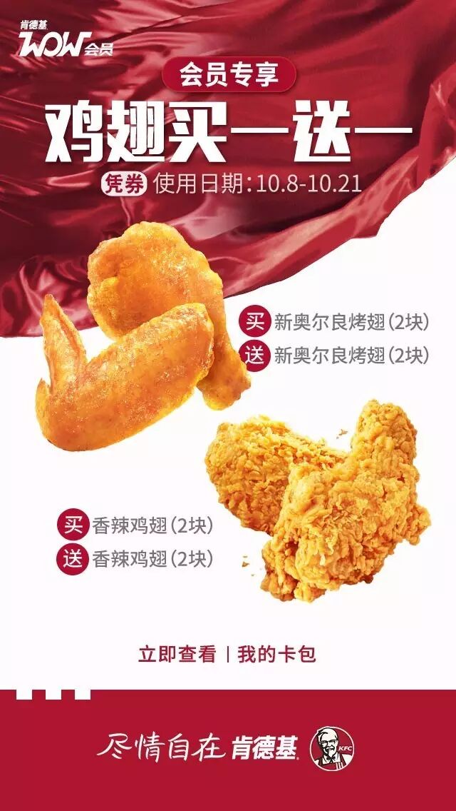 凭本券到店以单品价购买香辣鸡翅(2块)或新奥尔良烤翅(2块)可享该份产品买一送一优惠,限送同款