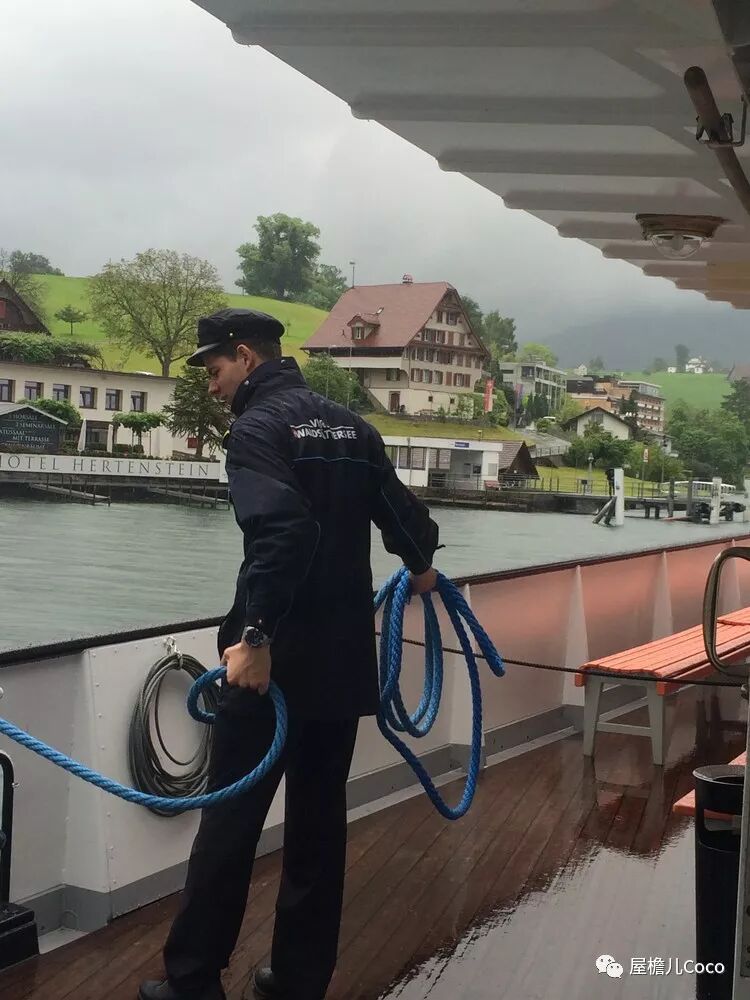 同苏黎世湖的游船一样,这里的船也会经停许多小站(上船前要看好,航线是往返还是单程,船的终点是哪里,经停那些小站,几点发船,在几号码头登船),在船上工作的帅小伙,每次都要冒雨出去抛出缆绳,接上梯子,也许是下雨的原因,他的动作娴熟而迅速,显得很潇洒。