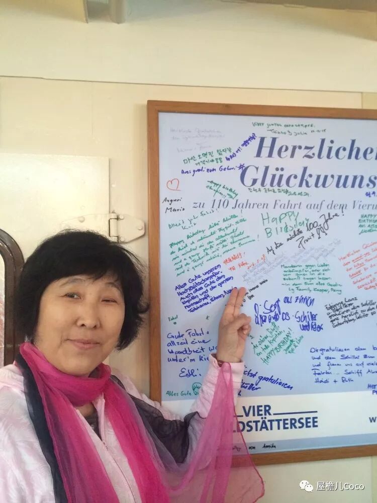 妈妈怕冷,在船舱里坐着,很快她发现了这块留言板,很荣幸,她在这里留下了第一段中文:快乐旅行!