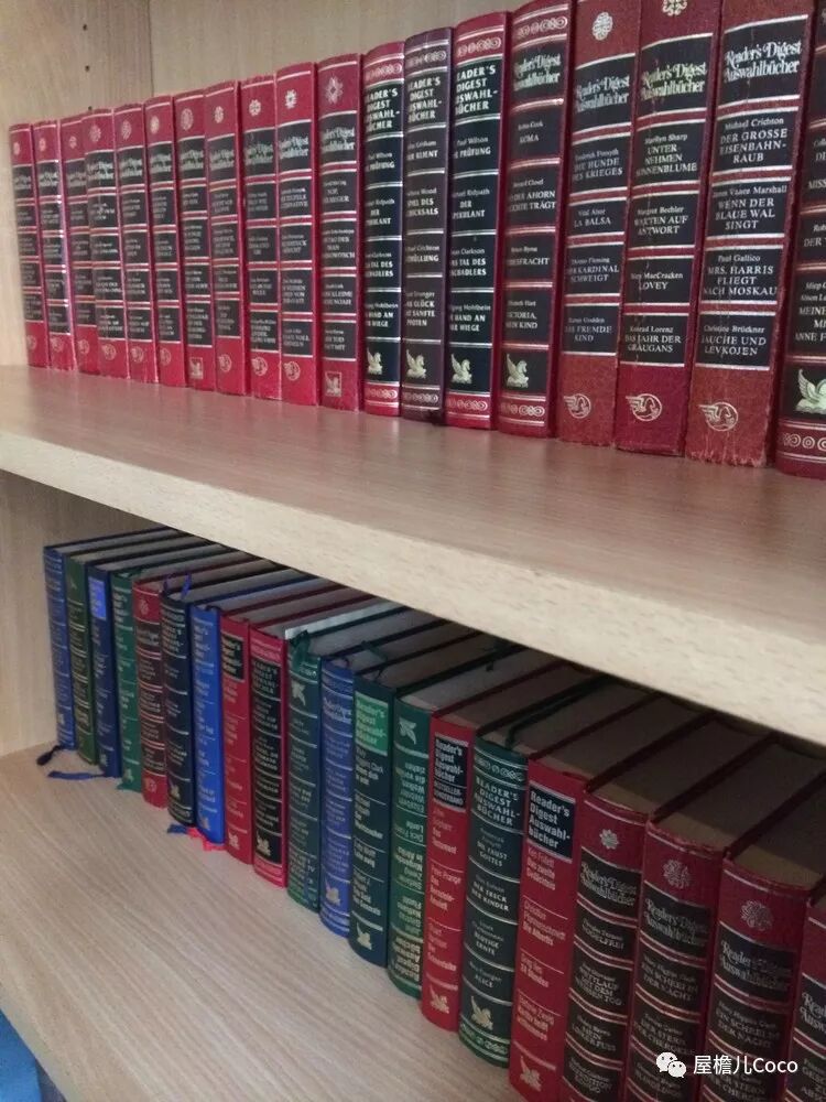 有个小书架,上面摆满了书,可惜都是德语的,我一本一本看过去也没有找到英语或者法语的,也不知道这一套套的是什么东西。