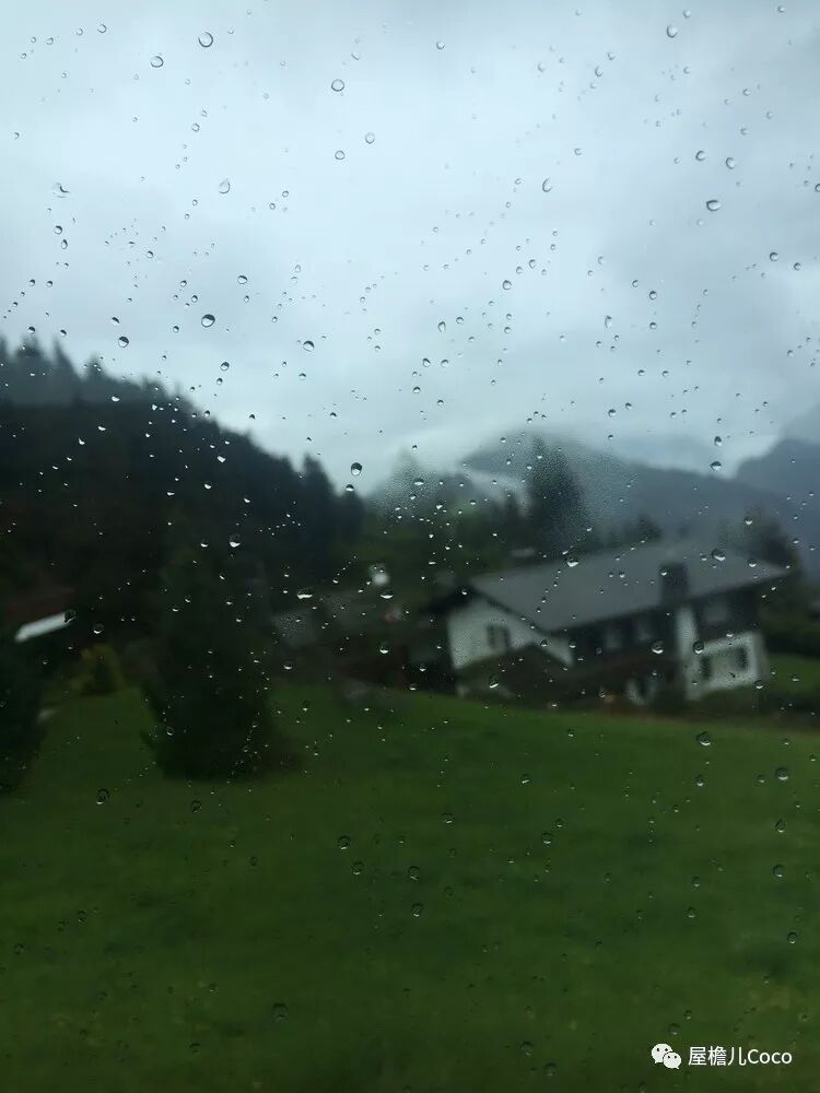 这张照片我很喜欢,平时想拍出都难,可能是由于外面有雾模糊不清的原因,手机自动对焦到车窗玻璃上了,一颗颗小水珠晶莹而清澈,由于光影的原因小水珠上部呈现黑色,像一个个留着西瓜头的小精灵。(后来我才知道瑞士人是那么地喜爱精灵)
