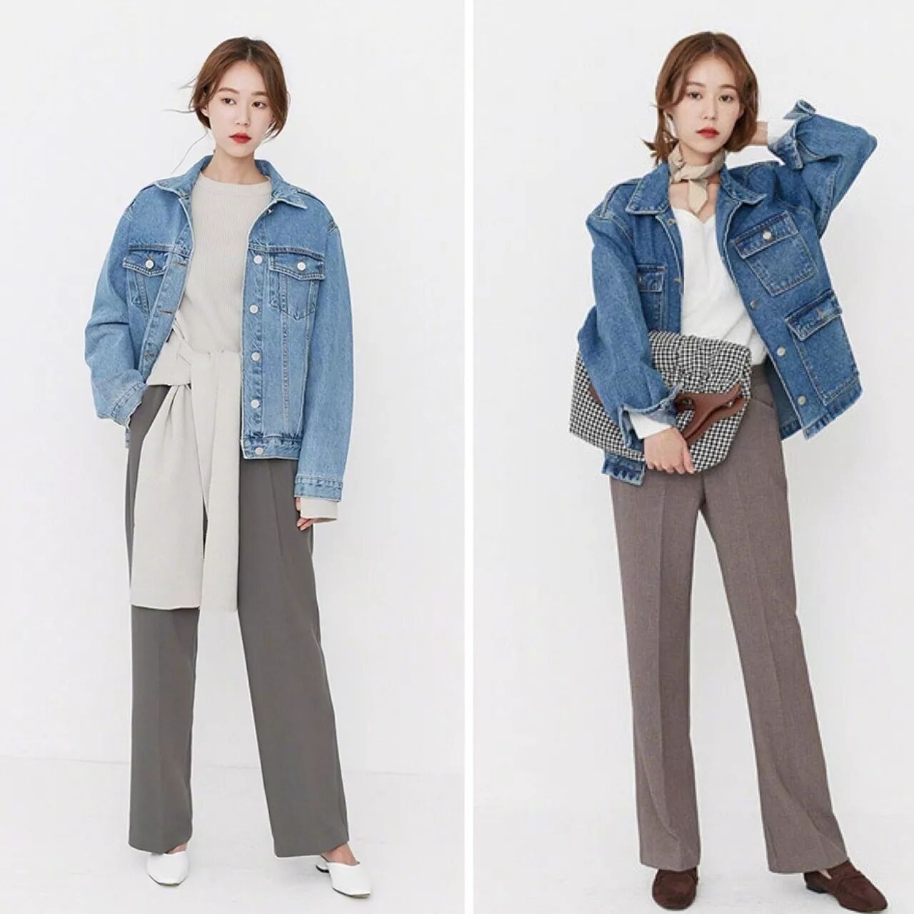 提起牛仔外套,大家都会觉得是超休闲的感觉。其实如果你想在上班的时候穿牛仔外套,不妨试试宽裤的搭配,可以穿出ol的感觉。